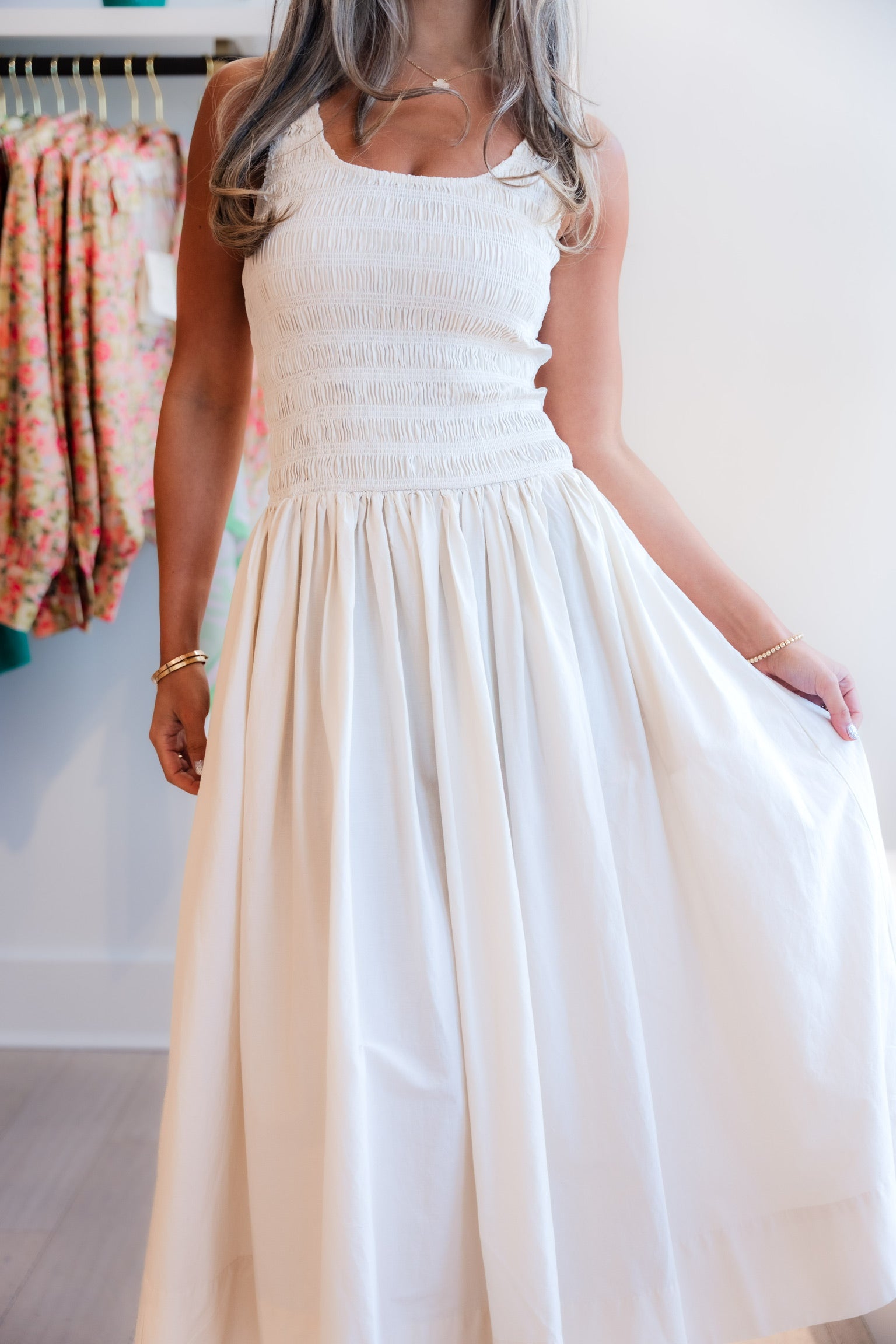 Textured day dress crafted from a lightweight fabrication designed with warm weather in mind. Featuring a smocked tank style bodice that falls into a ruched waistband and a fully proportioned midi skirt.