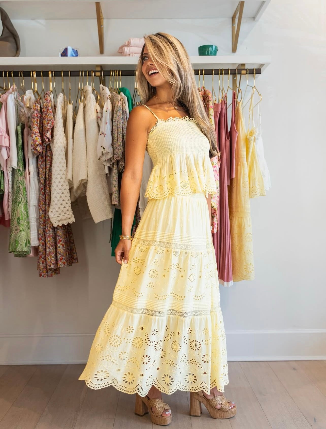 - Smocked elastic bust, Scalloped hem and trim with embroidered eyelet pattern