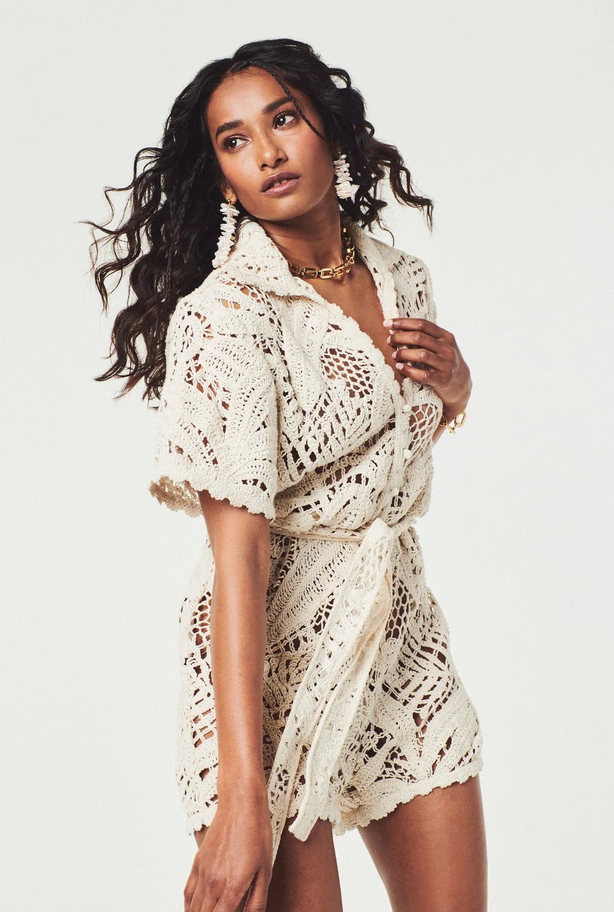Embrace effortless elegance in the Goa Romper by Hemant and Nandita. This chic piece is crafted from mid-weight crochet, featuring a stylish collared neckline and a charming button placket. Short sleeves and an optional self-belt allow for versatile styling that flatters your figure. The luxurious blend of cotton and nylon ensures a breathable fit while the sleek lining adds a touch of comfort. Perfect for leisurely afternoons or elevated evening outings, this romper is your new go-to staple.