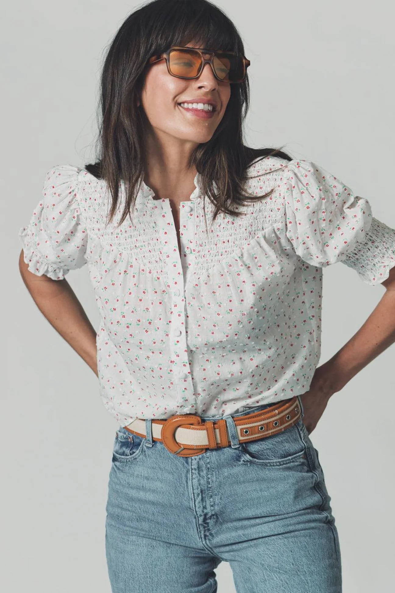 With a smocked top and contrasting stitching, a cropped shape and covered buttons, this is the sweetest top you’ll wear all season.