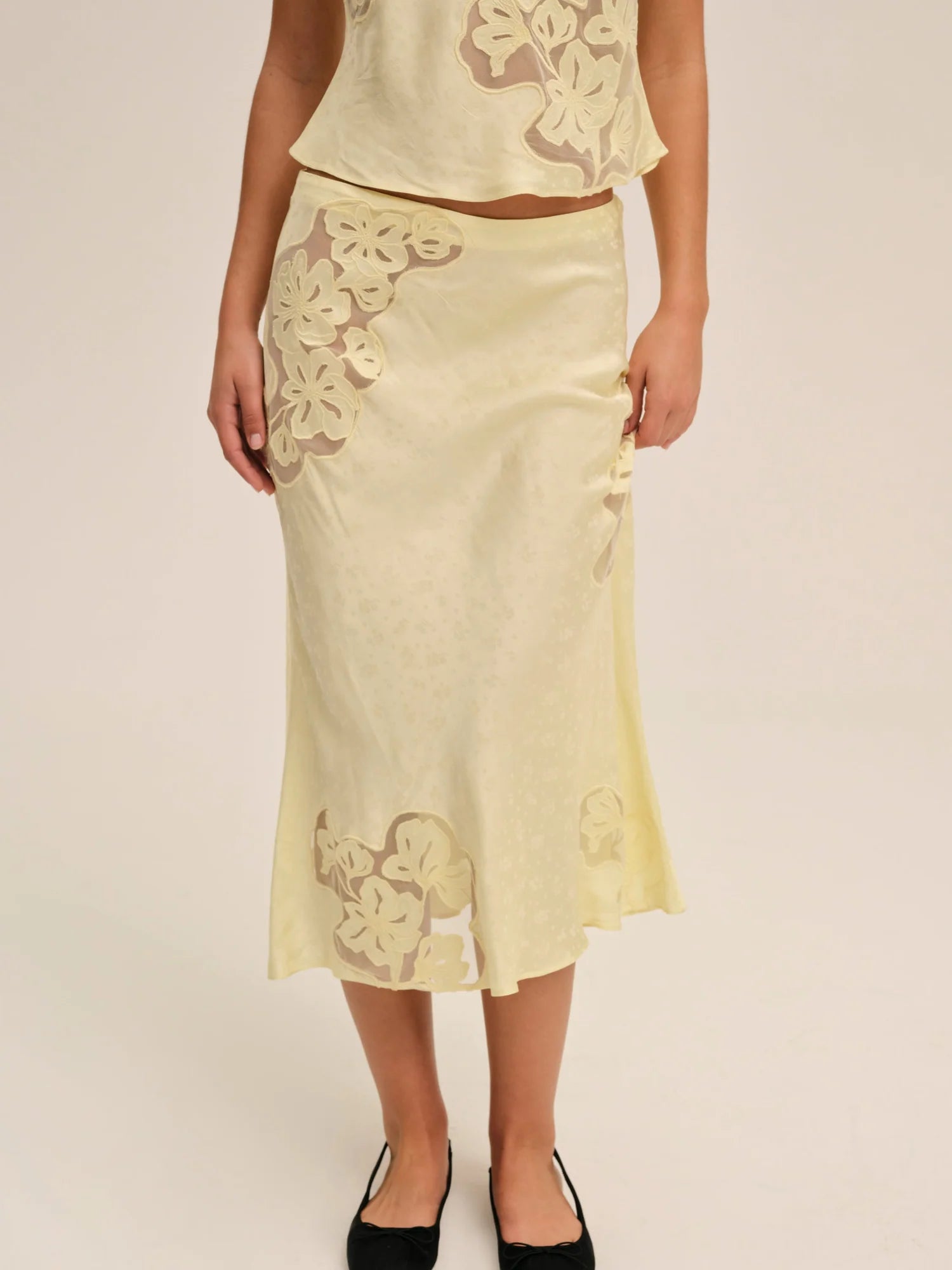 Featured in butter yellow—the hue of the summer—the Sunrise yellow midi skirt is cut to an effortless '90s silhouette with inset appliqués. Wear this satin skirt to drinks at golden hour.